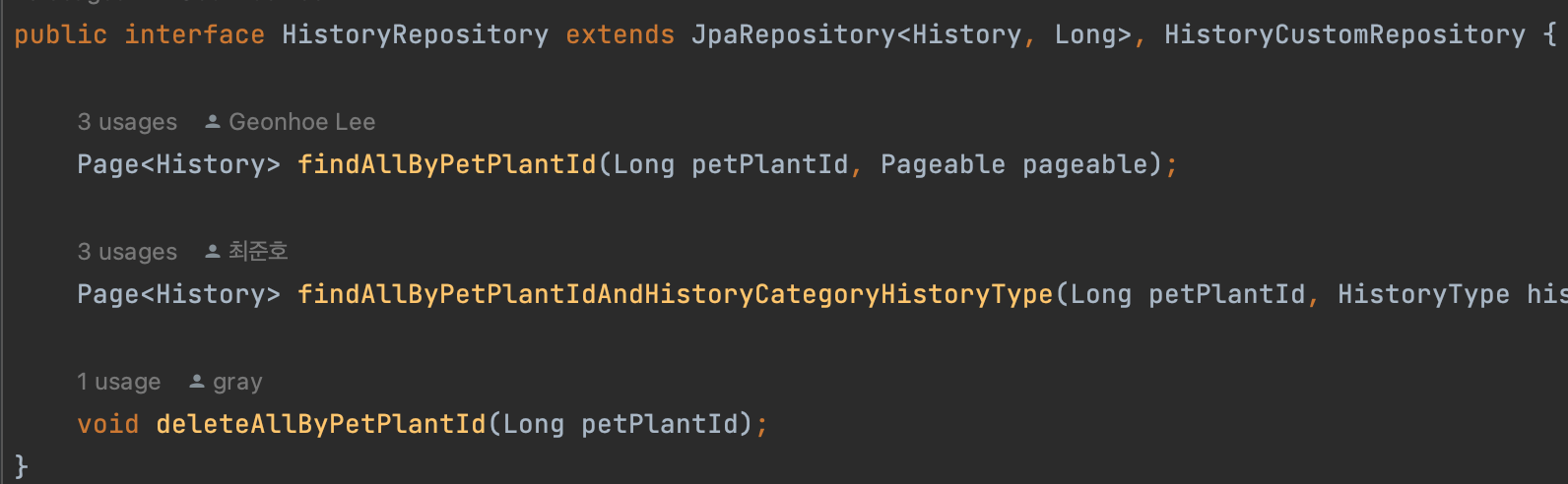 }기존에 주입받은 historyRepository를 활용해, 새로 생성한 findAllByPetPlantIdAndHistoryTypes 메소드를 사용하는 것을 확인할 수 있다.