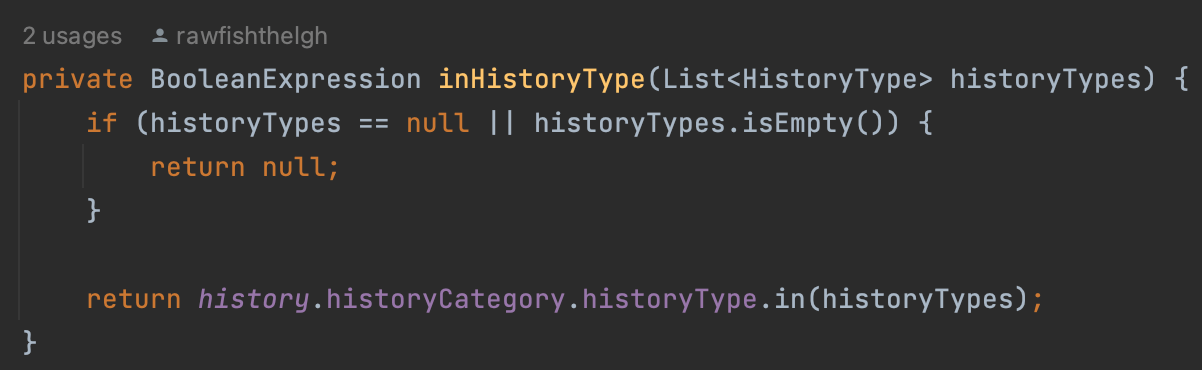 위는 in 절을 수행하는 inHistoryType 메소드다. 여기서 반환 타입을 BooleanExpression으로 사용한 것에 주목하자. BooleanExpression 의 반환값이 null일 경우, 자동으로 조건절에서 제외된다. 따라서 우리는 historyTypes가 들어오지 않았을 경우, in 절을 수행하지 않도록 지정했다.