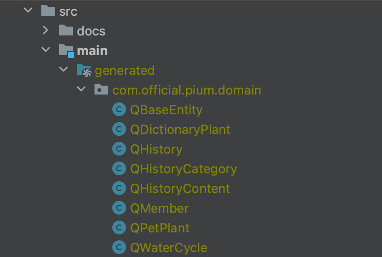 이제 바뀐 설정 파일로 build를 수행하면 우리가 지정한src/main/generated 경로에 위와 같은 Q Class가 생성된다.