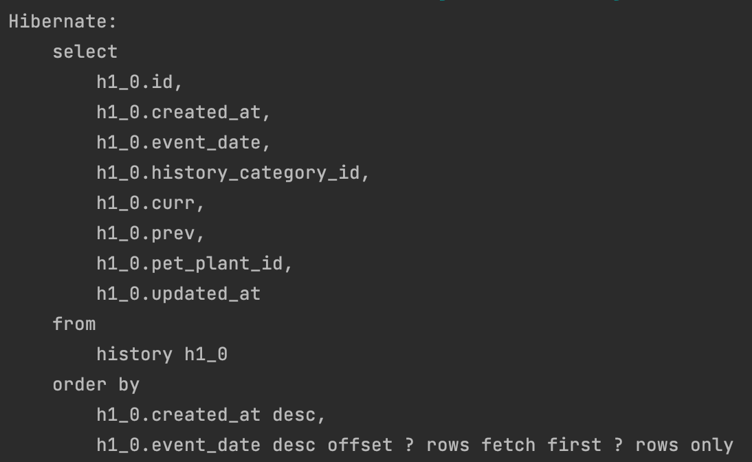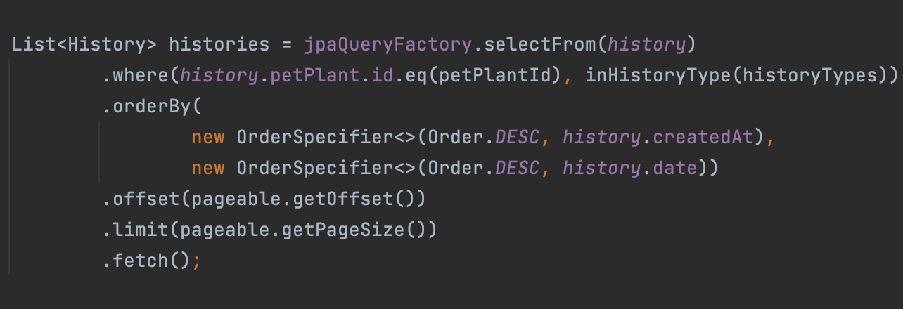 첫 인자에 Sorting 방향 Enum(Order.DESC)을, 두 번째 인자에 Sorting 대상 필드(history.createdAt)를 지정한다. 우리는 Sorting 조건이 두 가지이므로, 두 개의 OrderSpecifier 를 정의해 정렬 순서대로 넣어주었다.