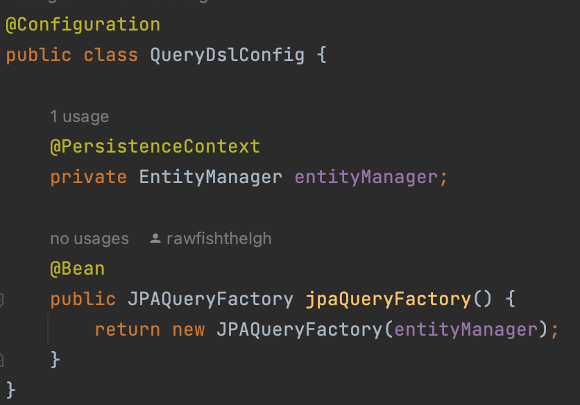 }JPAQueryFactory는 Querydsl을 사용하여 JPA 쿼리를 생성하고 실행하기 위한 클래스다. EntityManager를 주입해 JPAQueryFactory가 db 상호 작용을 수행할 수 있도록 해주는 Config 파일을 작성한다.
