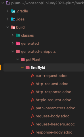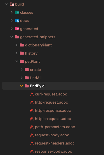 그러면 build/generated-snippets/{파라미터에서 설정한경로}에 adoc 파일이 생성된 것을 확인 할 수 있다.