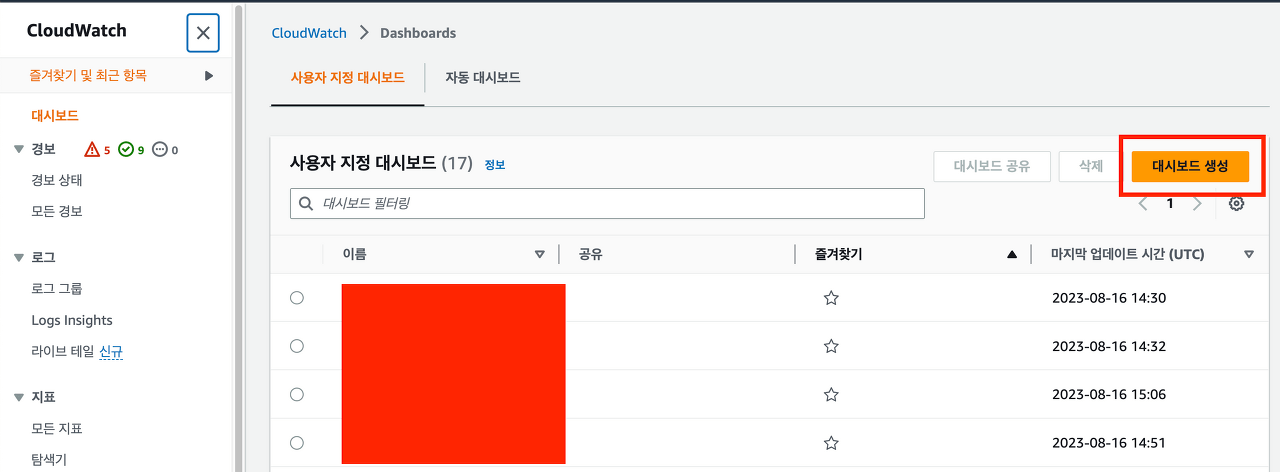 2. CloudWatch 탭으로 이동해 대시보드 생성을 누르고 원하는 이름을 자유롭게 설정하면 됩니다.