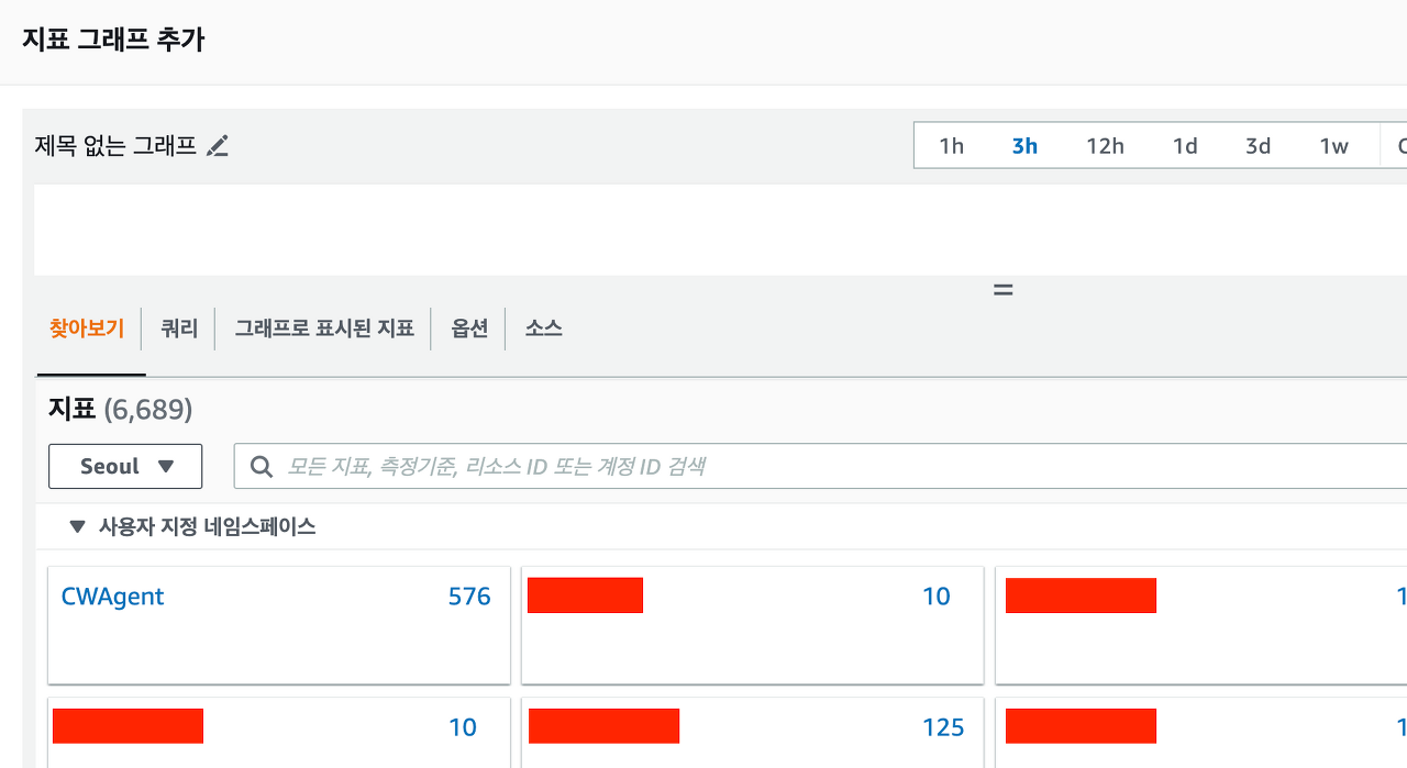 아래와 같이 사용자 지정 네임스페이스 구역을 확인합니다. 저는 config.json을 설정할 때 네임스페이스를 따로 설정하지 않았으므로 기본인 CWAgent에 추가됩니다.