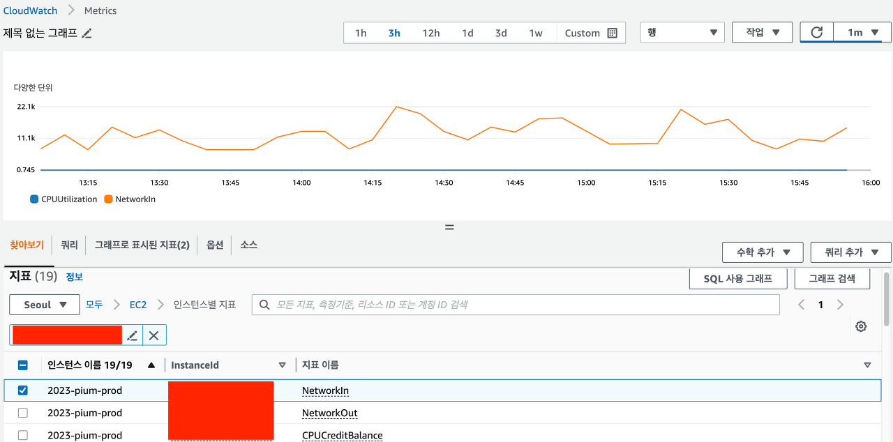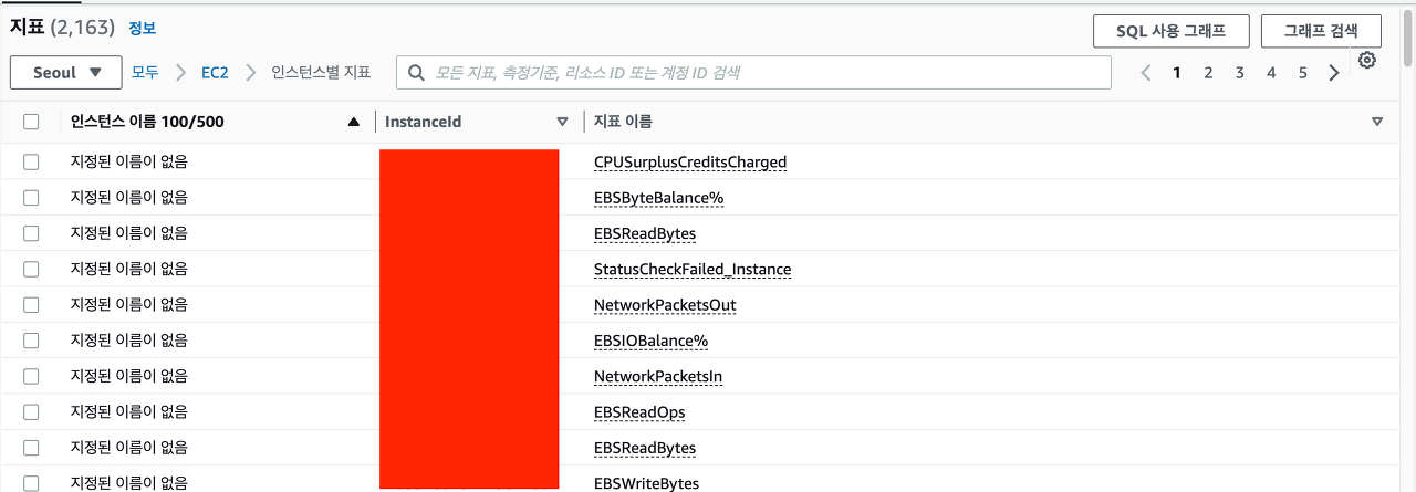 상단에 있는 검색 탭에 관측하고 싶은 인스턴스의 ID를 입력합니다. 예를 들면 i-0123456789 가 됩니다.