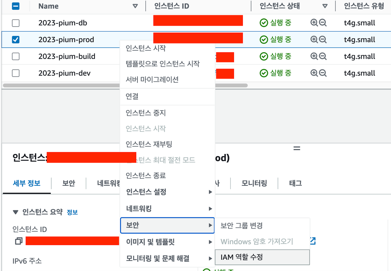 *1. 인스턴스 대시보드로 이동해 인스턴스 우클릭 -> 보안 -> IAM 역할 수정을 누르고 발급받은 IAM을 추가합니다.**
