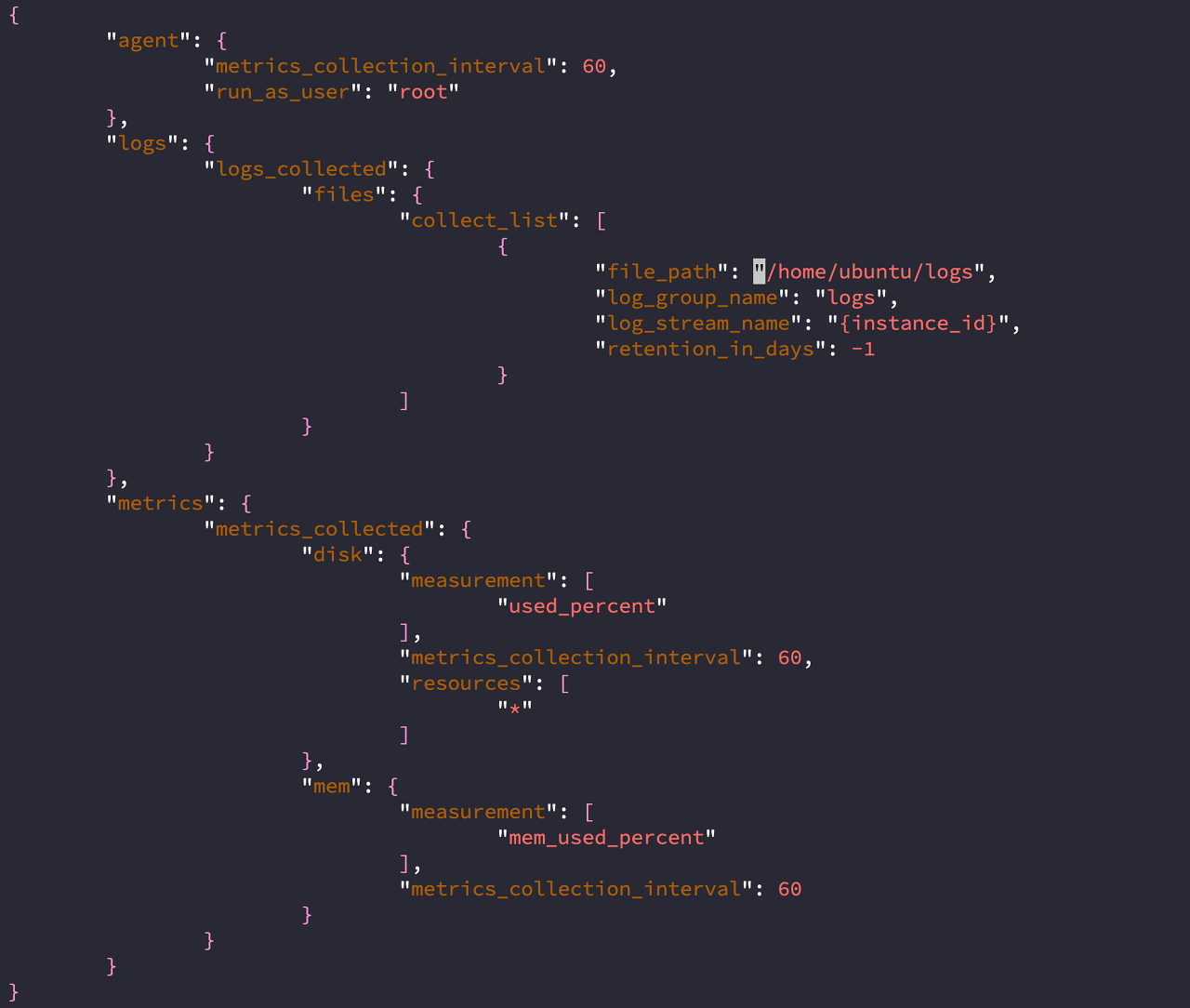 크게 agent, logs, metrics로 나뉘는데 agent는 계정과 권한에 관련된 부분이고 logs는 로그와 관련된 부분, metrics는 인스턴스 내의 모니터링과 관련된 부분입니다. 자세한 설정은 CloudWatch docs를 참고하시면 됩니다 !