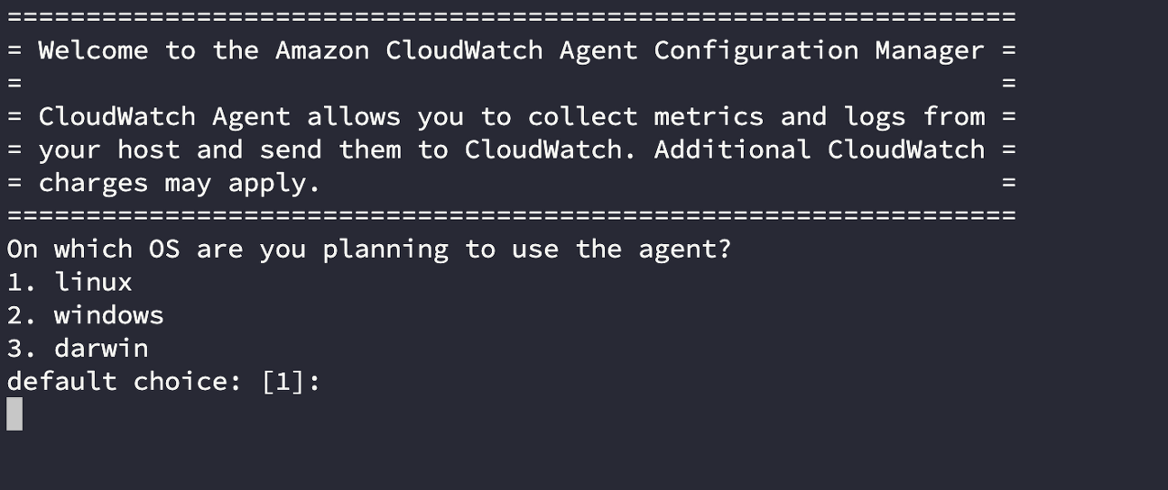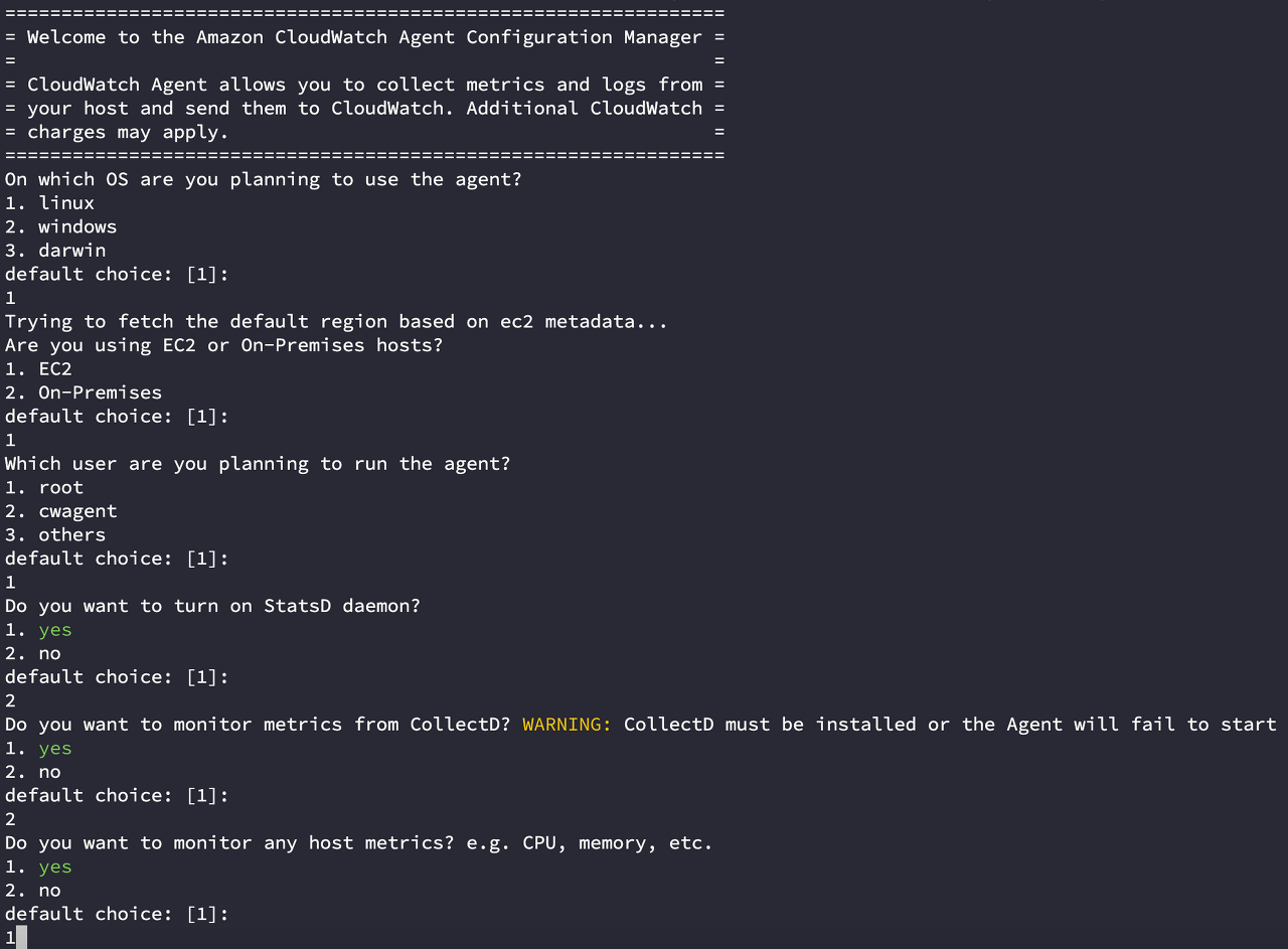 sudo /opt/aws/amazon-cloudwatch-agent/bin/amazon-cloudwatch-agent-config-wizard명령어를 입력하면 아래와 같이 질문에 대한 답을 입력하는 문구가 나옵니다.