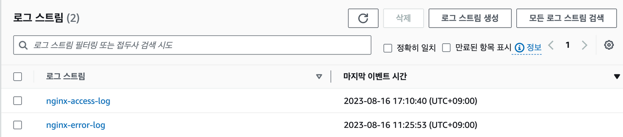 sudo /opt/aws/amazon-cloudwatch-agent/bin/amazon-cloudwatch-agent-ctl -a fetch-config -m ec2 -c file:/opt/aws/amazon-cloudwatch-agent/bin/config.json -s정상적으로 적용되면 로그 그룹 내에 로그 스트림이 생성되는 것을 확인할 수 있습니다.