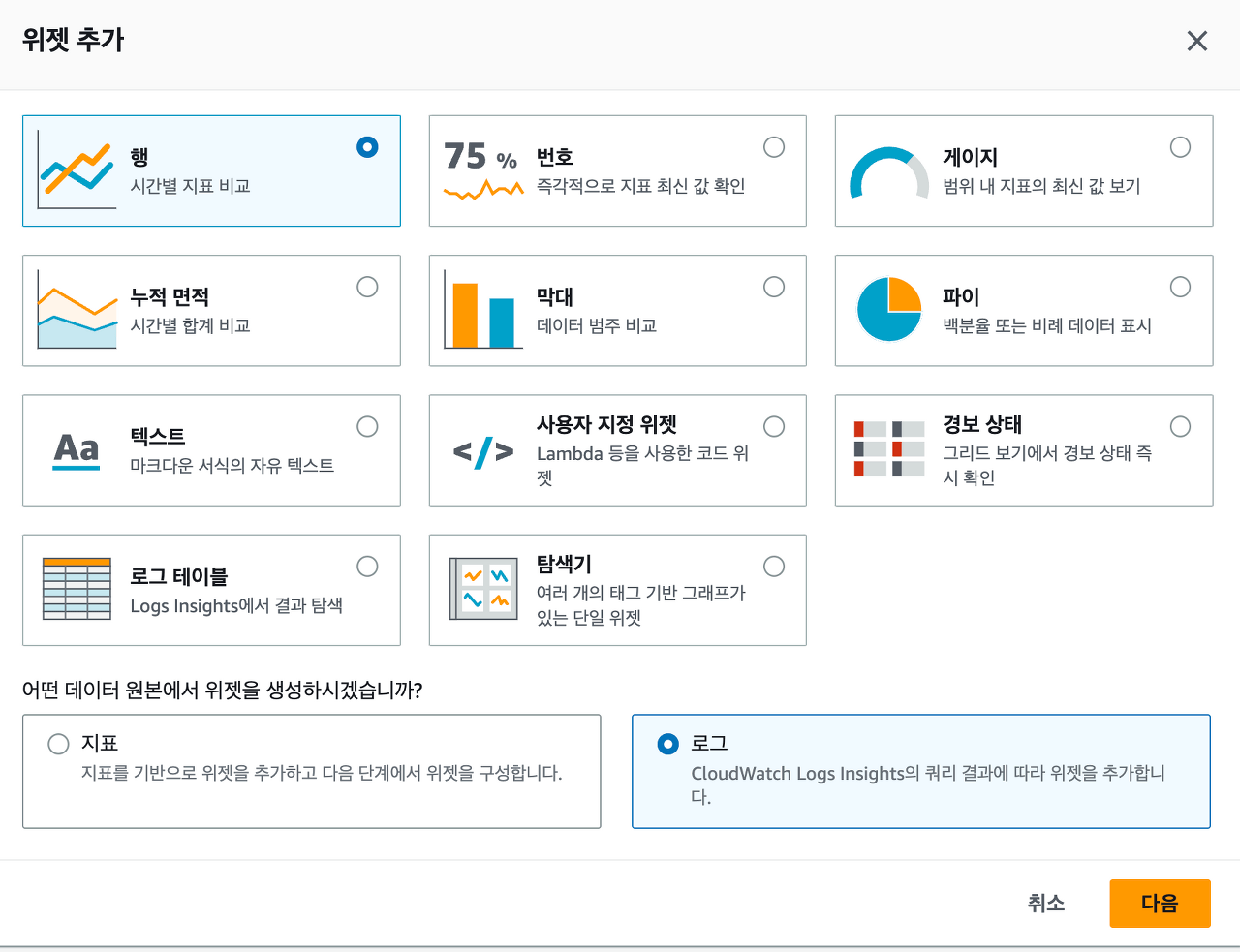 지표 대신 로그를 선택해서 추가할 수 있습니다.
