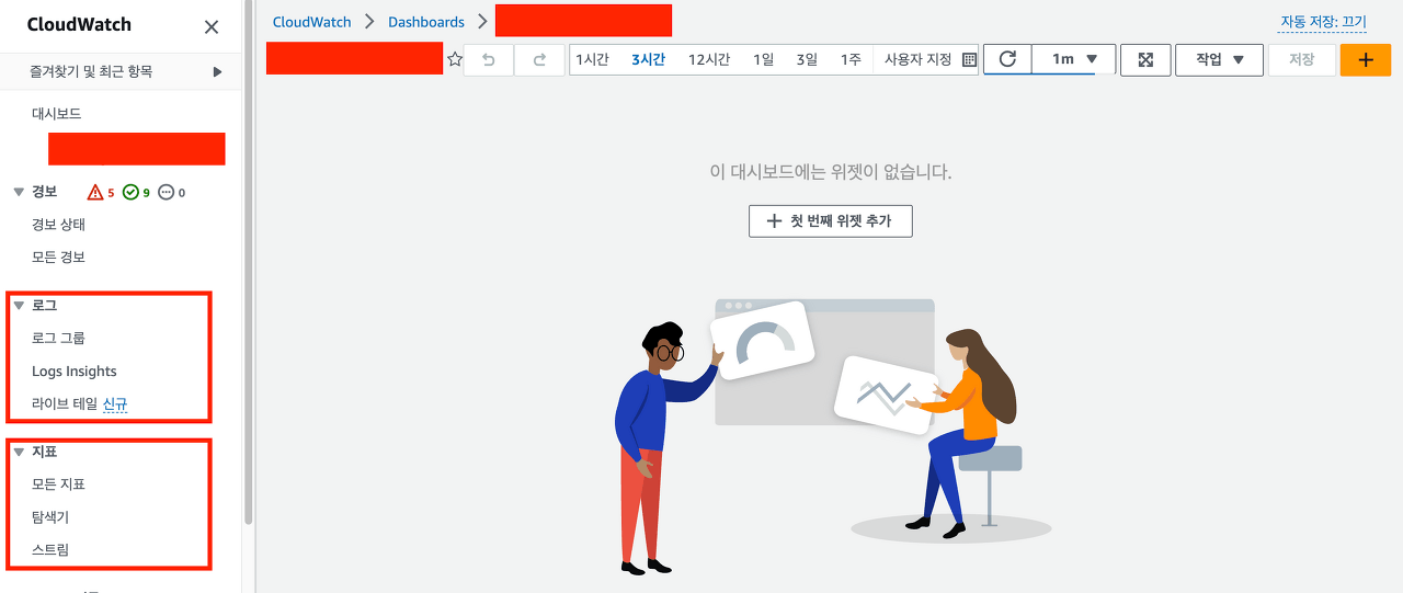 대시보드로 돌아와 위젯 추가를 눌러 지표를 확인합니다.
