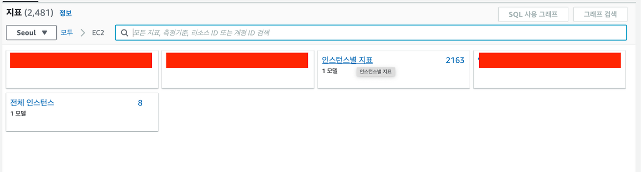 EC2 탭을 누르고 들어오면 아래와 같은 화면을 볼 수 있고 인스턴스별 지표를 확인해야 하기 때문에 인스턴스별 지표를 누릅니다.