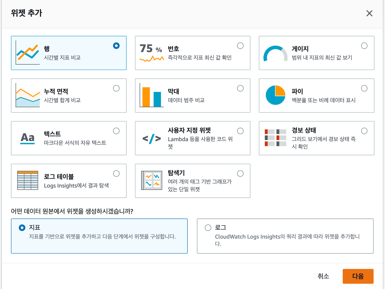 우측 상단에 있는 + 버튼을 누르면 지표나 로그를 추가하는 화면을 볼 수 있습니다.