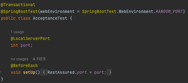 당시 다음과 같은 인수 테스트 환경에서 테스트를 수행하고 있었다. 각 테스트 메소드가 끝난 후 트랜잭션을 롤백시켜 격리를 보장하기 위해 클래스 레벨에 @Transactional 어노테이션을 선언했었다.
