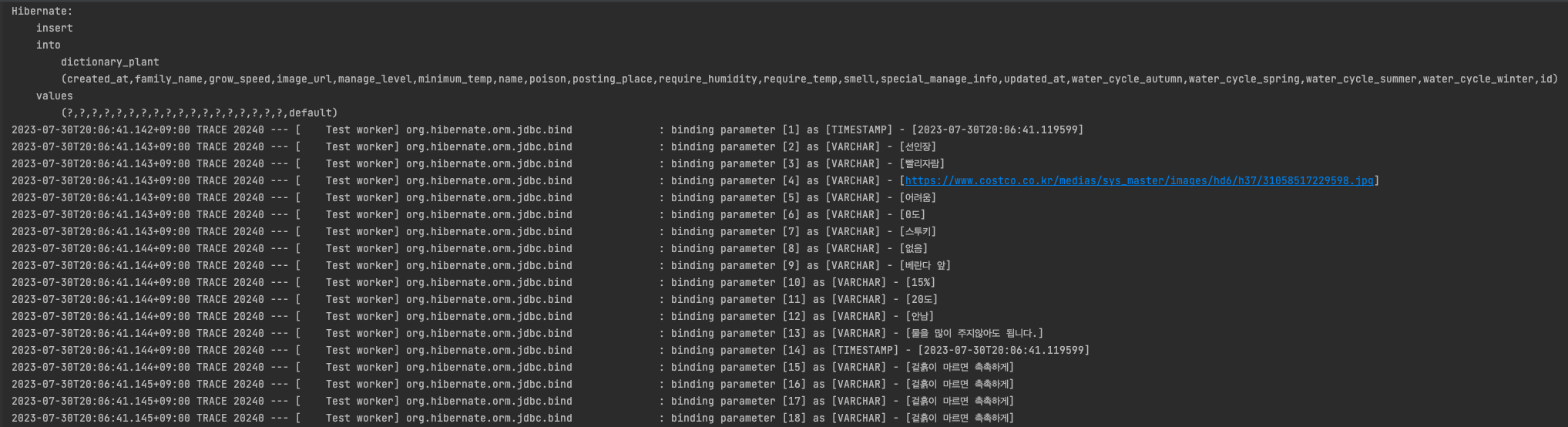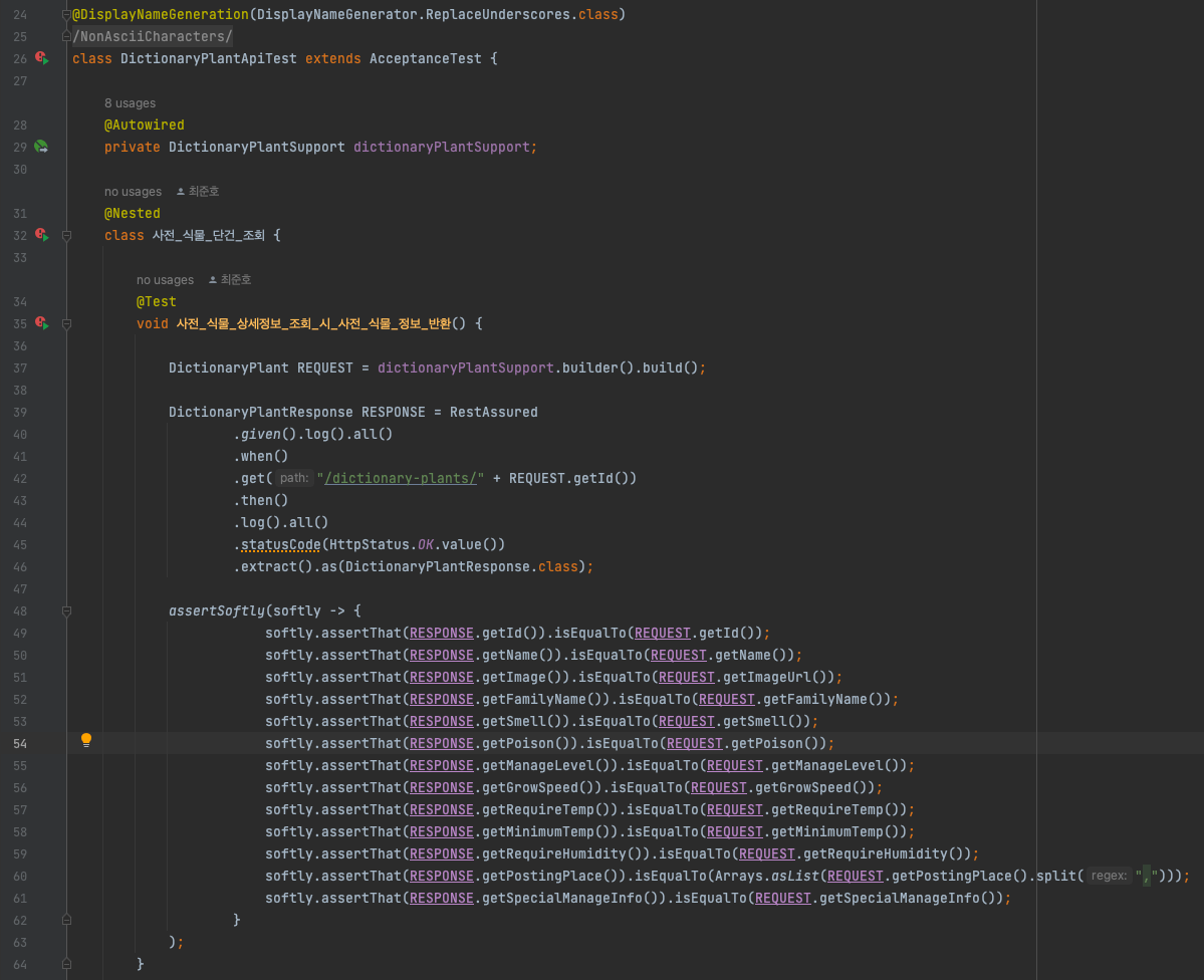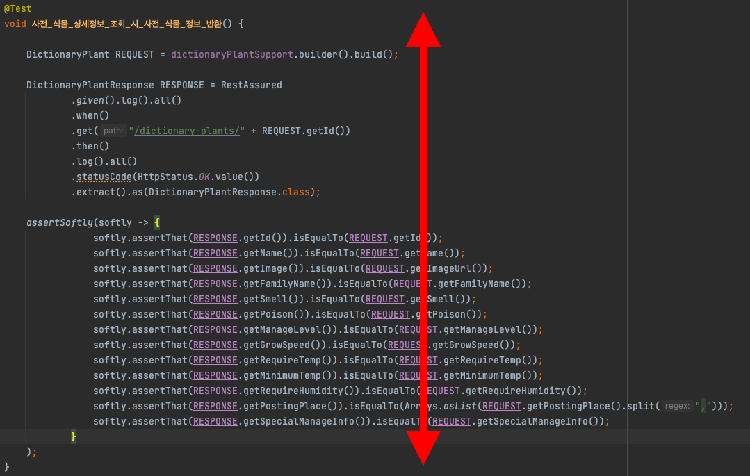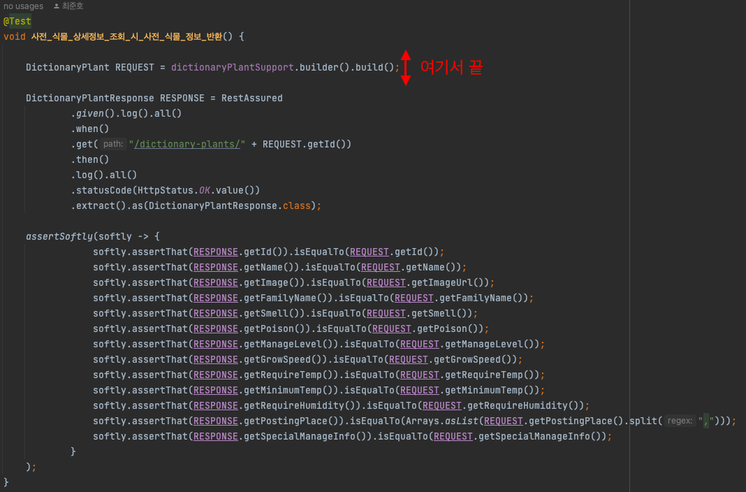 즉, 현재 테스트 메소드는 repository에 사전 식물 객체를 저장하고, 이를 RestAssured를 활용하여 실제 서버에서 요청을 보내 저장된 사전 식물이 조회되는지를 확인하는 과정이다.