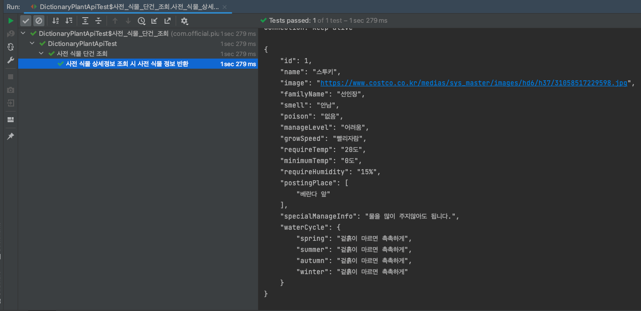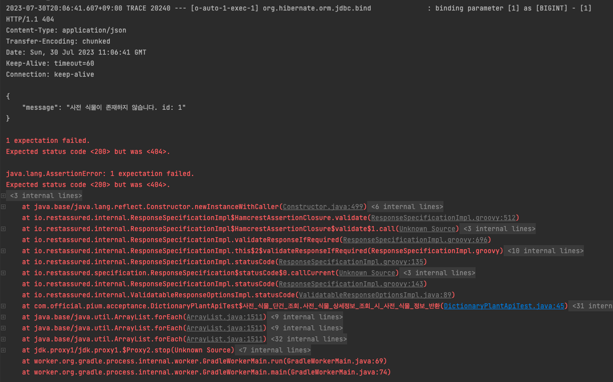 그런데, 200 OK를 기대했던 테스트의 결과가 404 not found가 응답되고 사전 식물이 존재하지 않는다는 예외 메세지가 뜨는 것을 확인하게 되었다.